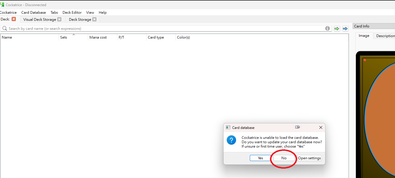 打開Cockatrice時,程式會問你要不要更新卡片資料庫(Card Database),選擇不要(No)。