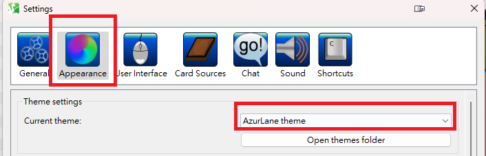 - 前往 Cockatrice/themes/,將「AzurLane theme」資料夾放在那裡。